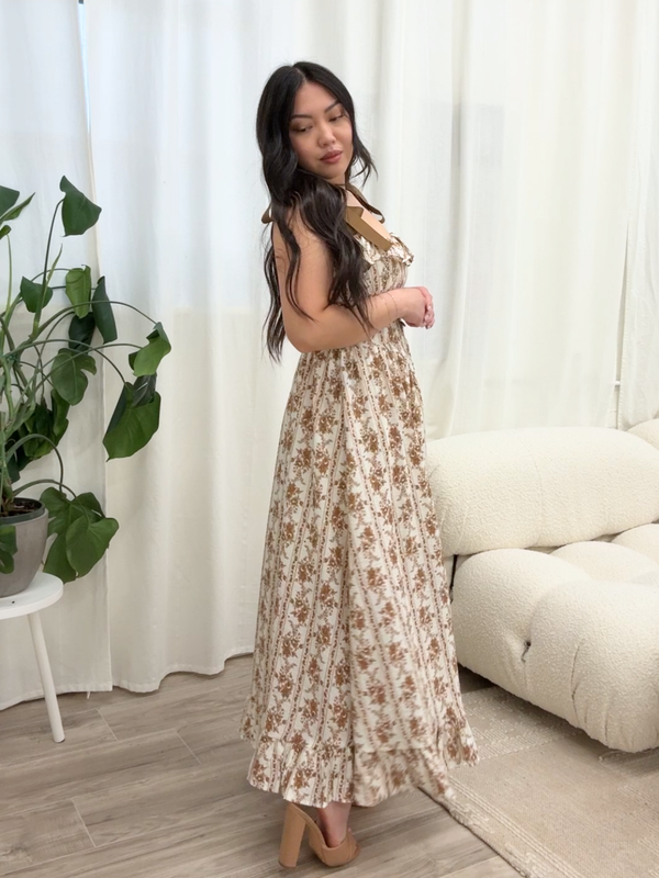 Color is a multi mauve with floral print. Surplice neckline. Single button closure. Back keyhole. Bishop sleeves. Smocked waist. Tiered bottom. Petite friendly. Fully lined. 100% polyester. Mina is 5ft...