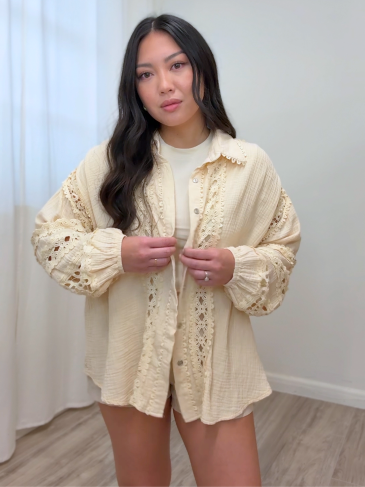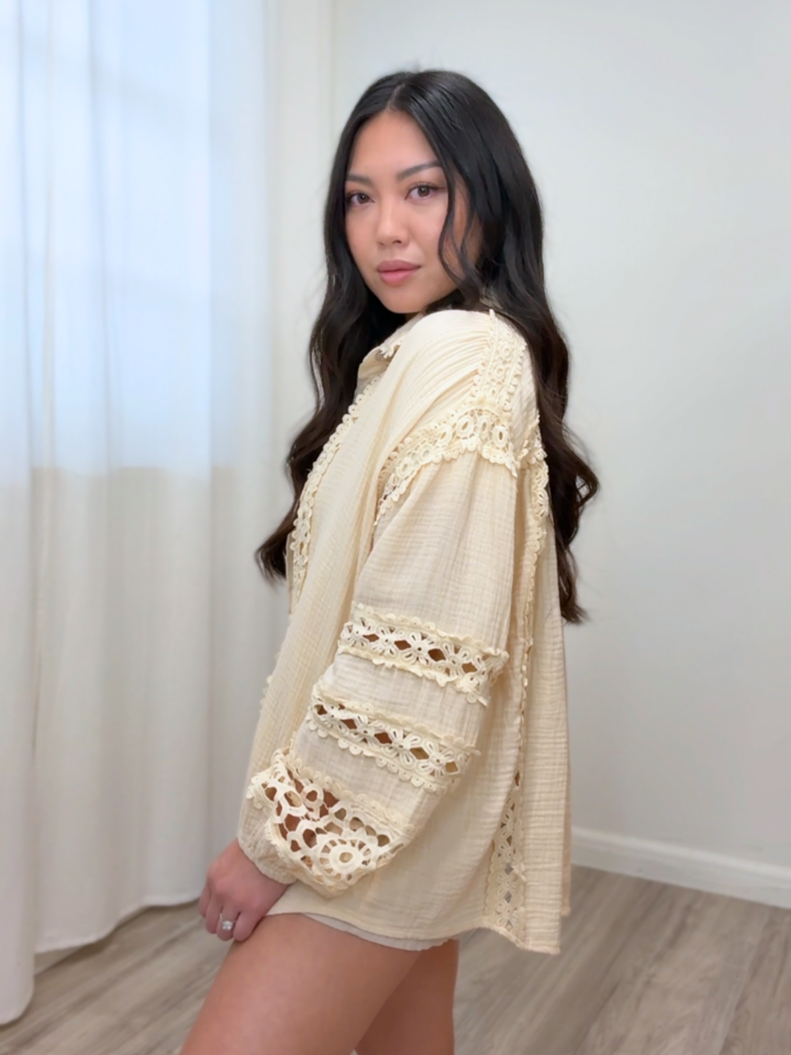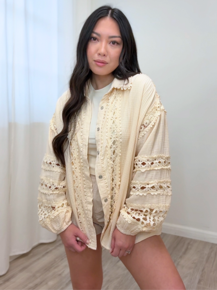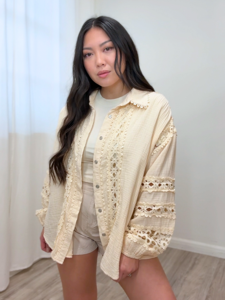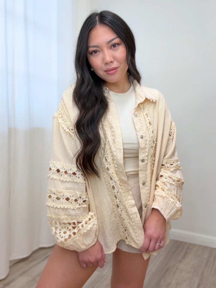 - Crochet designs along shirt and sleeves.